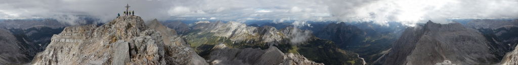 Kurz dahinter steht die Biwakschachtel und die letzte Anstrengung stellen seilversicherte Steilstufen dar, die man in leichter Kletterei überwindet. Ein Kamin bildet den Abschluss kurz vor dem Gipfel und dann stehen wir (naja, zumindest ich) erschöpft am Gipfelkreuz. Außer uns sind noch drei andere Wanderer hier, die mit uns vom Karwendelhaus aufgebrochen sind. Von hier aus können wir ins gesamte Karwendel blicken. Wirklich ein wunderschöner Anblick.