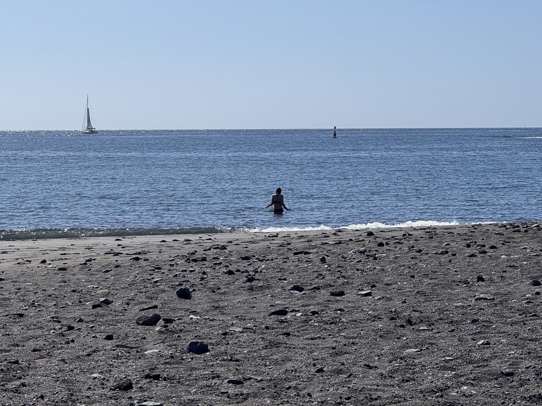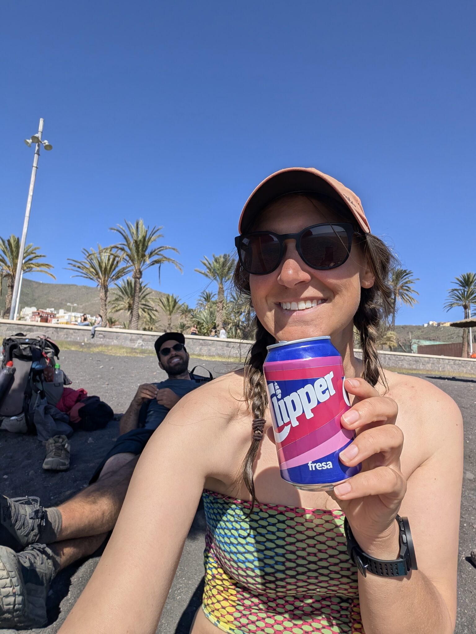 Die Suche nach einer Toilette endet in einer Schlange, dann ein kurzer Besuch im Supermarkt. Das alles wird mir schnell zu viel – zu laut, zu eng. Das Meer ist genau das, was wir brauchen, also gehen wir schnurstracks zum Strand. Wir setzen uns ans Wasser, lassen den Tag kurz stillstehen, trinken unsere Clipper. Wenig später kommt auch Kristina dazu.