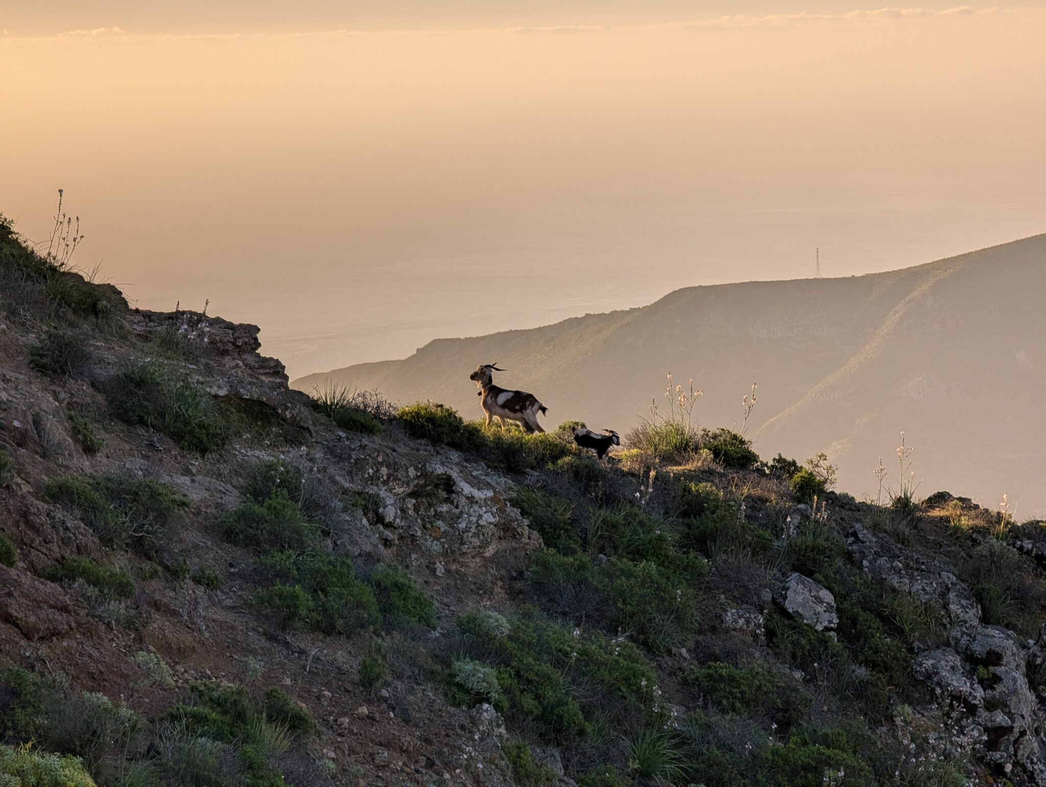 Ein kurzer Anstieg führt uns schließlich hinauf auf einen Grat, von dem aus wir bereits San Sebastián in der Ferne erkennen können. Wir beschließen, hier zu bleiben. Mit nur noch acht Kilometern bis in die Stadt und der einzigen direkten Fähre nach La Palma am Abend können wir uns Zeit lassen und die letzte Nacht auf La Gomera genießen. Wir werfen unsere Isomatten in den Dreck und essen cold-soaked Linsensalat, dazu ein weiteres Sandwich und einen Apfel als Nachtisch, während wir der untergehenden Sonne zusehen. Die blasse Sichel des zunehmenden Mondes hängt am Himmel.
