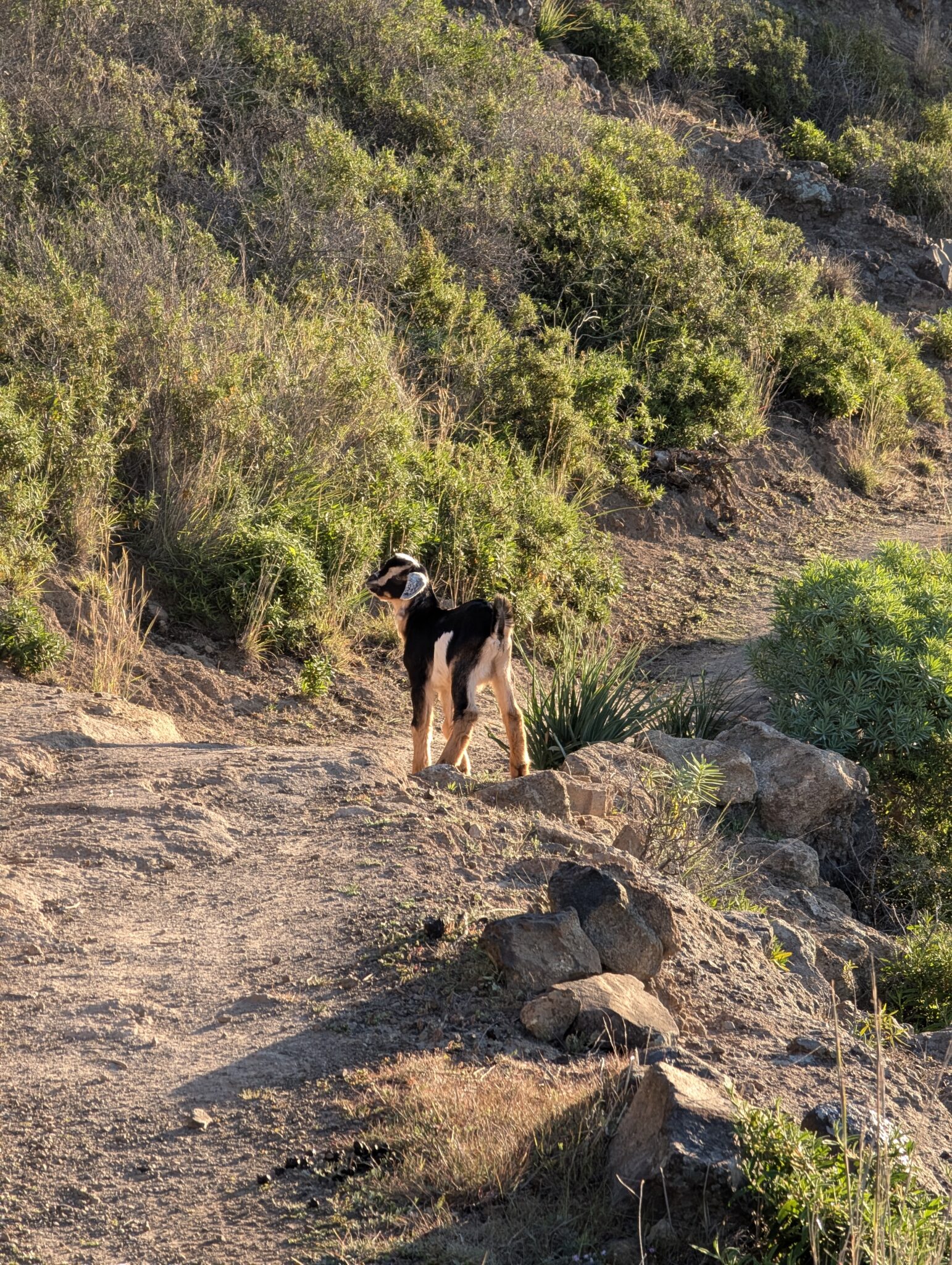 Kurz darauf begegnen wir einer Ziegenfamilie. Mutter und ein Jungtier flüchten den Hang hinauf, während das zweite zögert. Für einen Moment steht es unschlüssig da, dann merkt es, dass es allein zurückgelassen wurde, und beginnt lautstark zu protestieren, bevor es hinterherläuft. Das wird wohl eines Tages zum Inhalt von Gesprächen mit seinem Ziegen-Therapeuten werden.