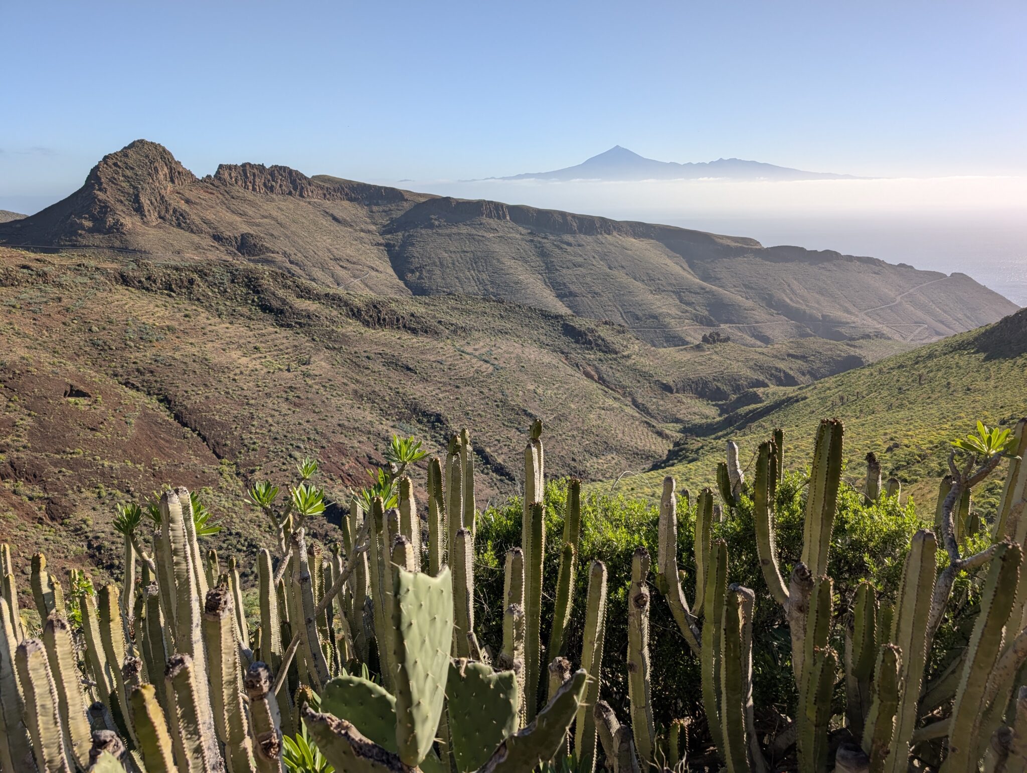 Wir starten gegen acht Uhr, wie mittlerweile fast jeden Tag. Die Luft sieht aus wie in Los Angeles im Hochsommer – milchig, schwer, unangenehm. Nur dass es hier kein Smog ist, sondern Staub aus der Sahara. Calima liegt weiterhin über La Gomera. Wir husten, niesen, schnäuzen. Meine Erkältung hält sich hartnäckig, und der Staub macht es nicht besser. Das Licht wirkt wie gefiltert, als hätte jemand einen Schleier über die Sonne gelegt.