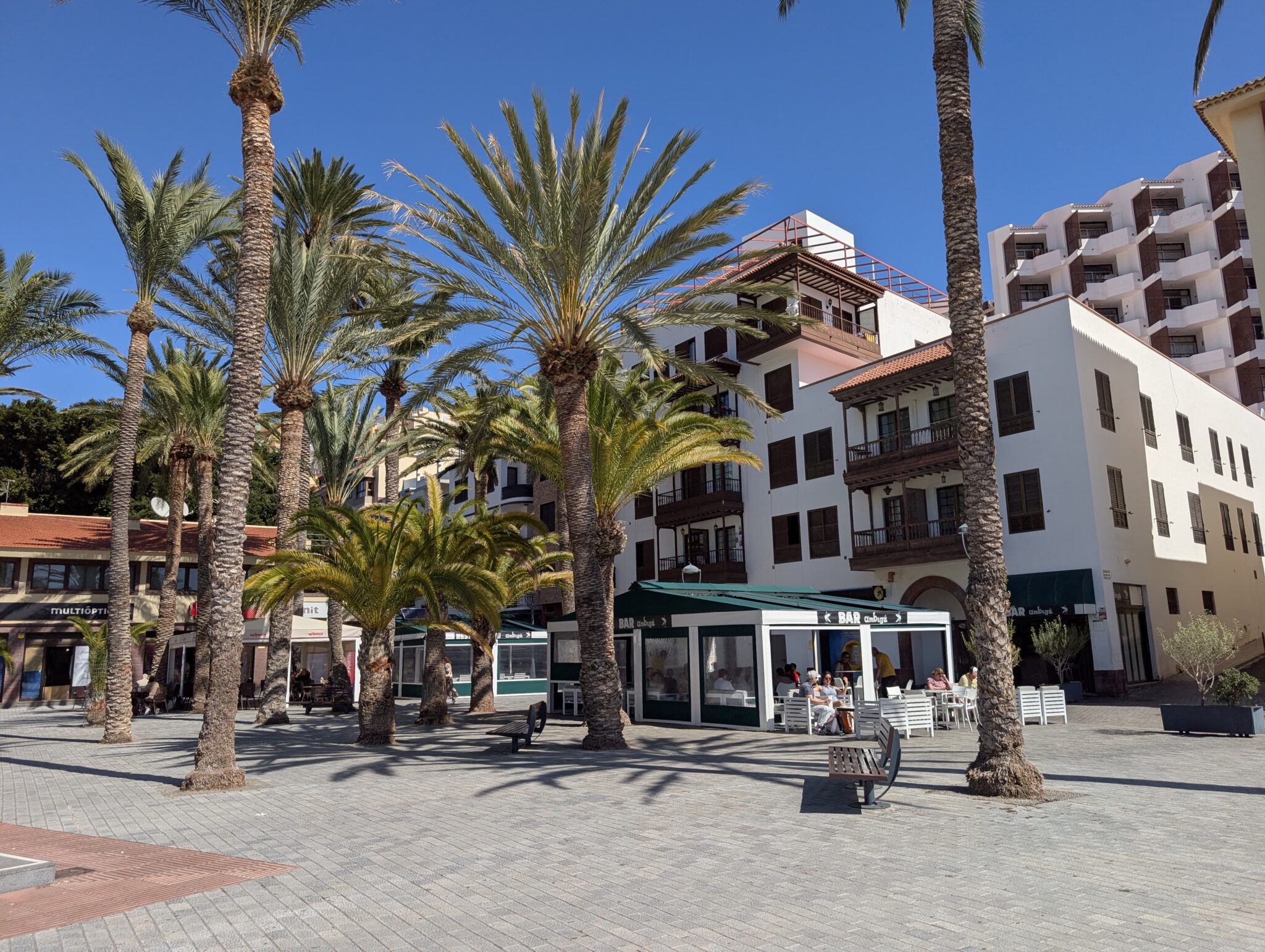 Die Fähren nach La Gomera fahren nur zweimal am Tag: einmal um neun Uhr morgens und dann wieder am Nachmittag. So bleiben uns dreieinhalb Stunden in Los Cristianos, die wir irgendwie überbrücken müssen. Angesichts der staubigen Luft und des üblichen touristischen Trubels fällt das nicht leicht.