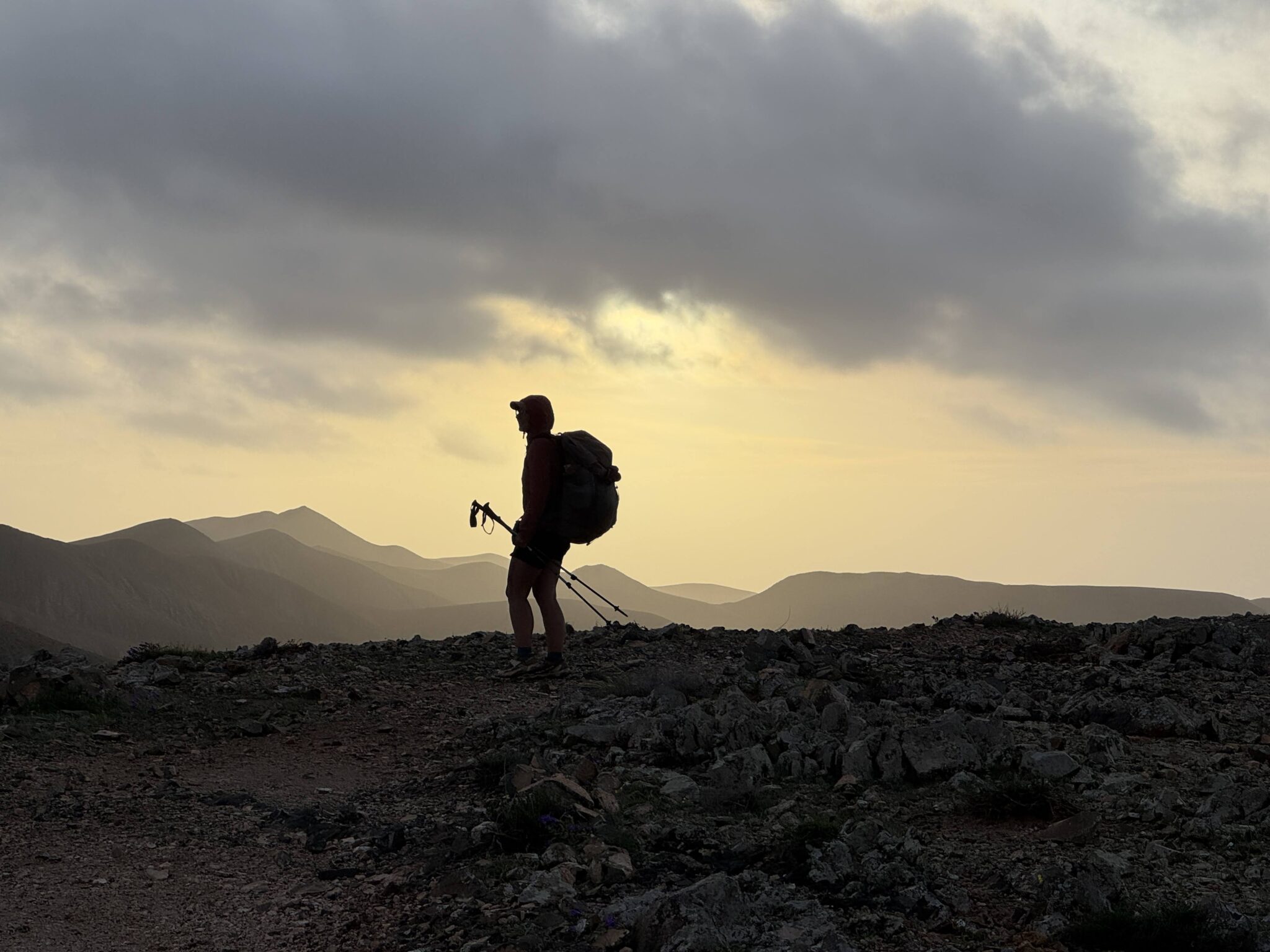Am Morgen strahlt die Sonne auf den Vulkankegel des Tindaya und lässt seine Flanken golden aufleuchten, während ringsum noch graue Wolken hängen. Wir freuen uns darauf, den Berg zu besteigen. Wir gehen gerade von unserem Schlafplatz zurück auf den GR 131, als eine Wanderin vorbeizieht, die wir seit unserem ersten Tag auf Lanzarote nicht mehr gesehen haben. Noch immer wissen wir nichts über sie, aber in unserer internen Logik hat sie längst einen Trailnamen bekommen: Jetski.