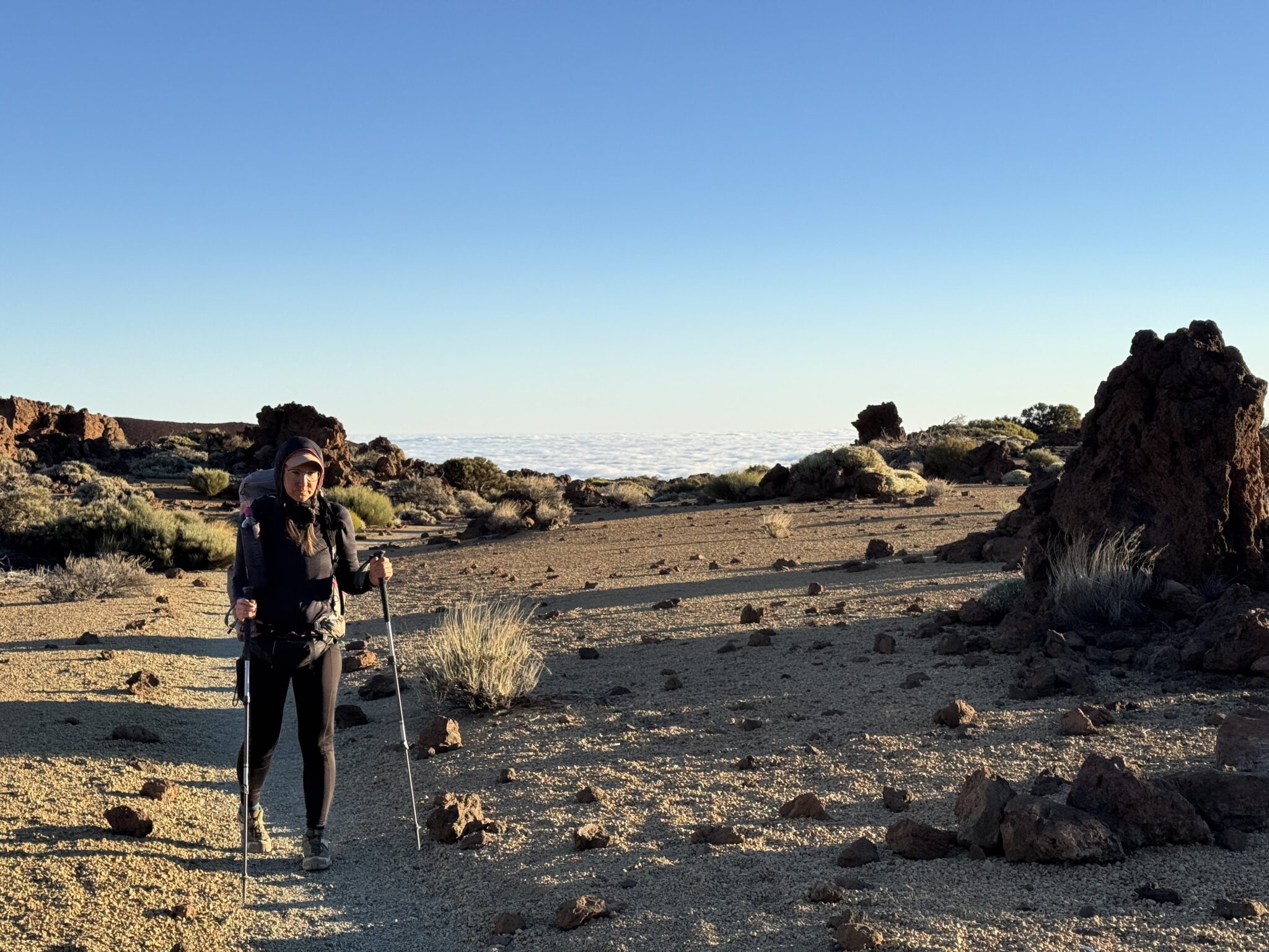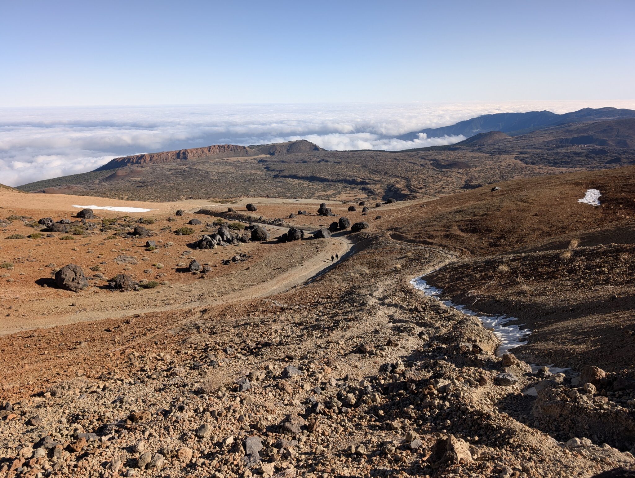 Dann öffnet sich plötzlich der Blick und wir sehen Teide. Sein Gipfel ist schneebedeckt und wirkt von hier aus viel größer als noch von Gran Canaria. Über uns spannt sich ein klarer, blauer Himmel, während unter uns weiterhin ein Wolkenmeer liegt, aus dem nur einige Berggipfel herausragen.