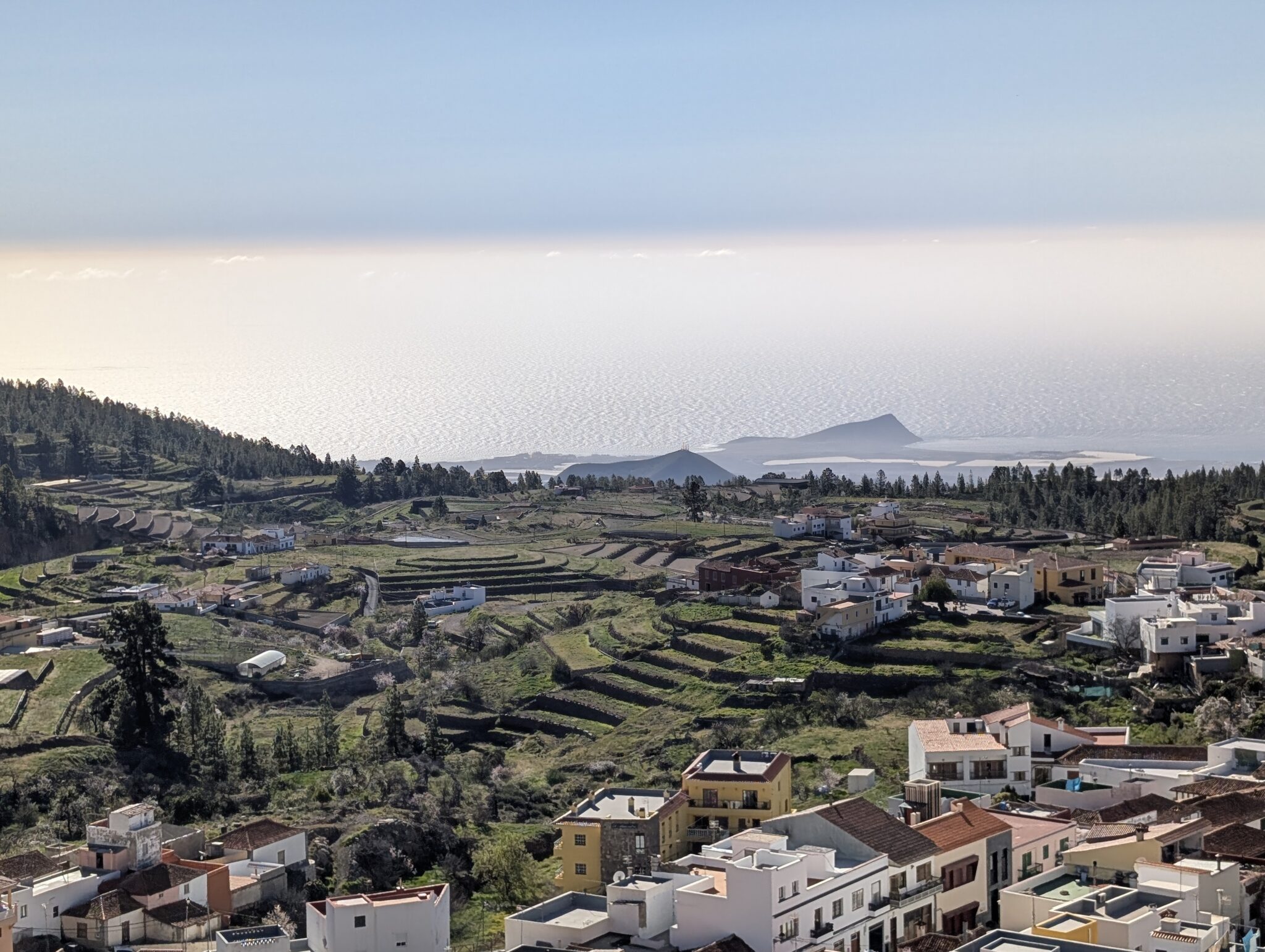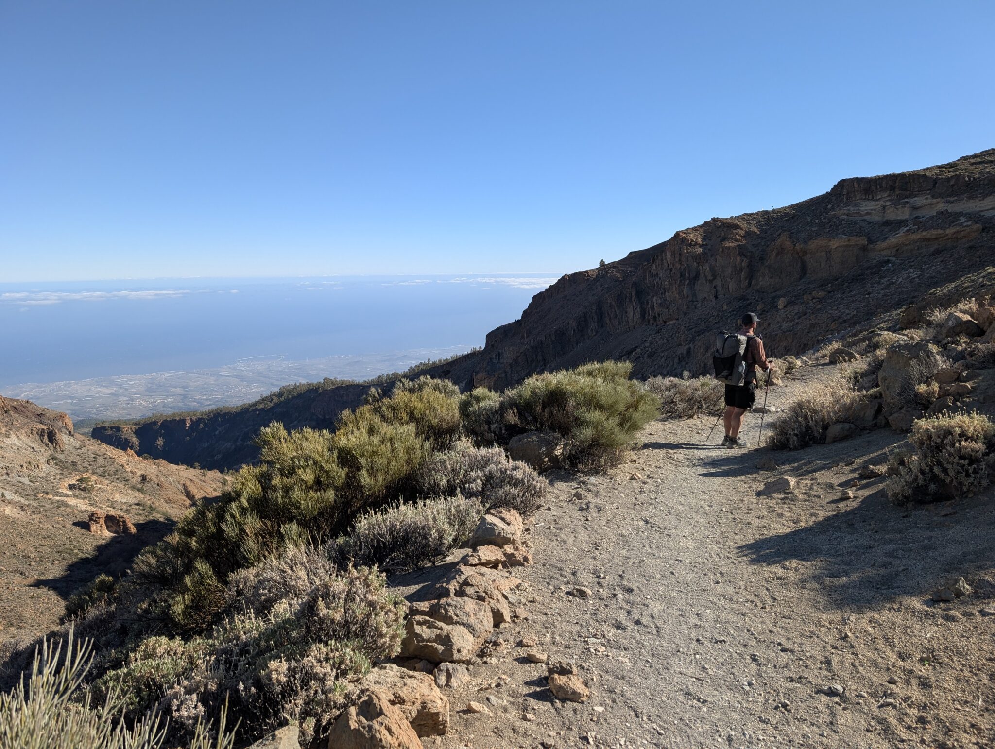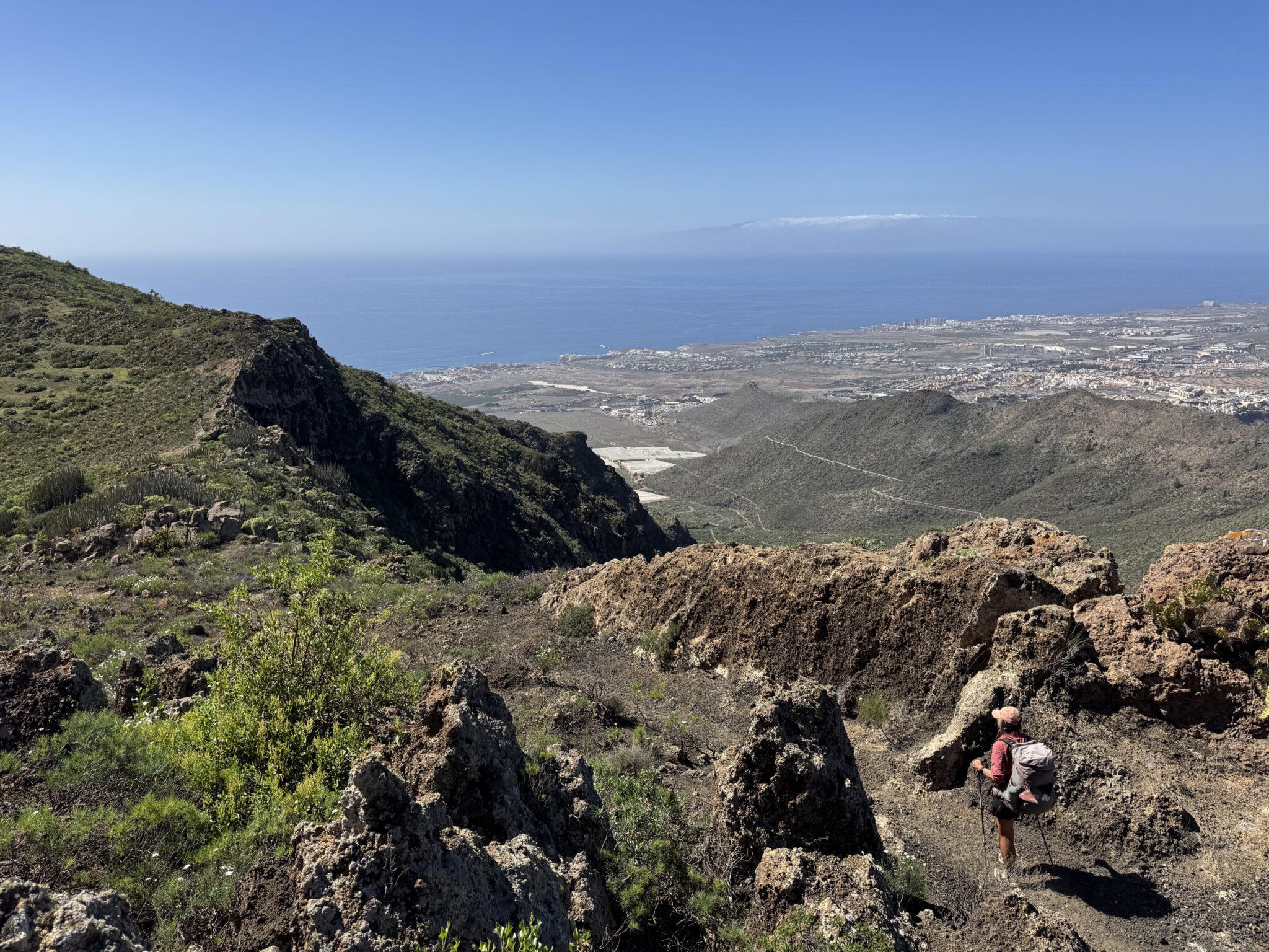 Nun beginnt der lange Abstieg Richtung Küste, die wir bereits unter uns sehen können. Die Wolkendecke hat sich etwas verzogen und gibt den Blick auf den Hafen von Los Cristianos frei. Am Horizont ragen die höchsten Berge von Gran Canaria aus den Wolken. Vor wenigen Tagen standen wir noch dort oben und haben in diese Richtung geschaut.