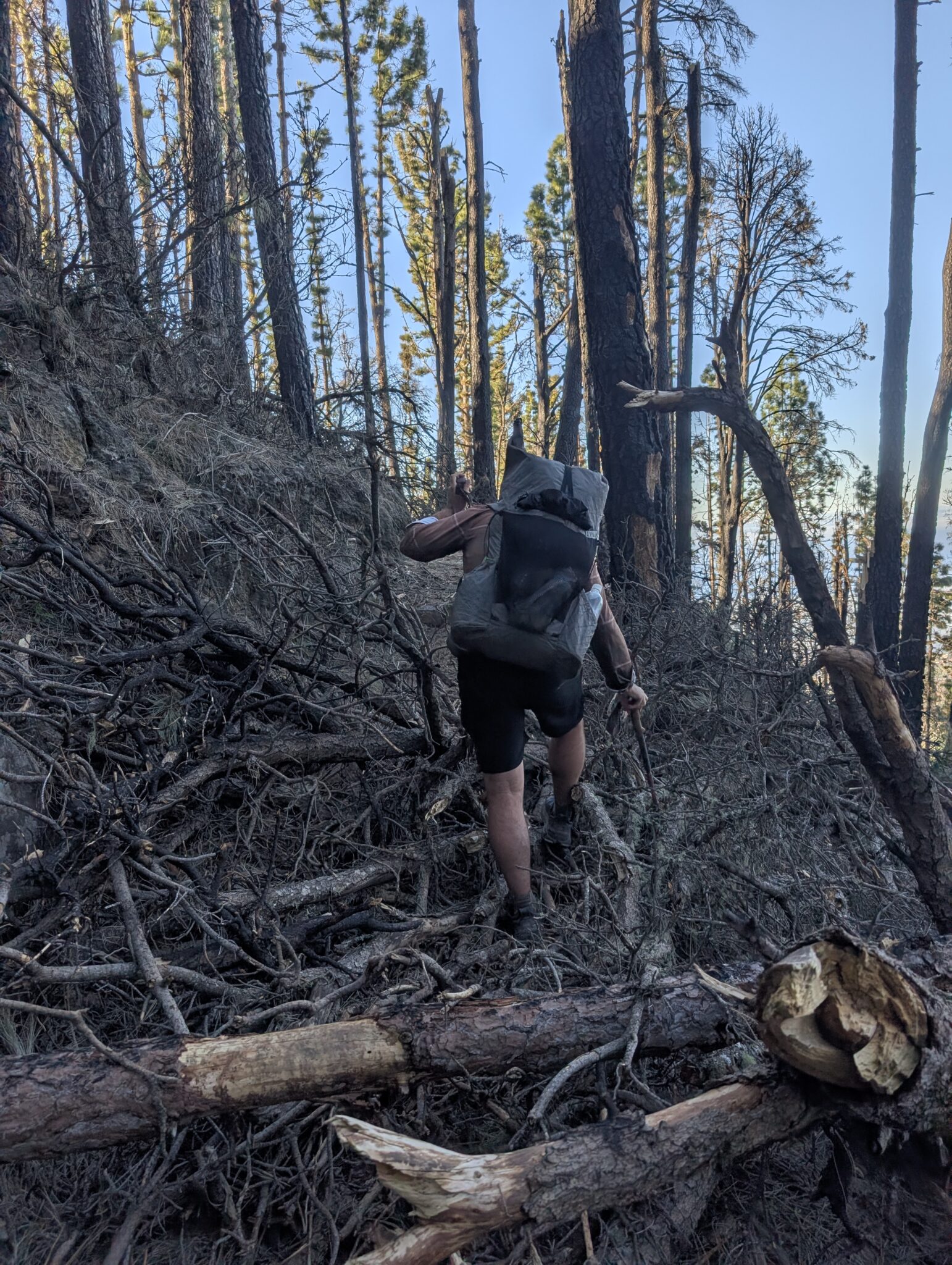 Der Trail, der eigentlich gemütlich bergab führen sollte, ist nicht nur mehr überwuchert, sondern alle paar Meter von umgestürzten Bäumen blockiert. Überall liegen Blowdowns kreuz und quer über den Hang. Wir klettern über Stämme, kriechen unter Ästen hindurch oder versuchen, seitlich am Hang entlang zu klettern. Der Fortschritt ist quälend langsam, aber der einzige Ausweg ist, weiterzugehen.