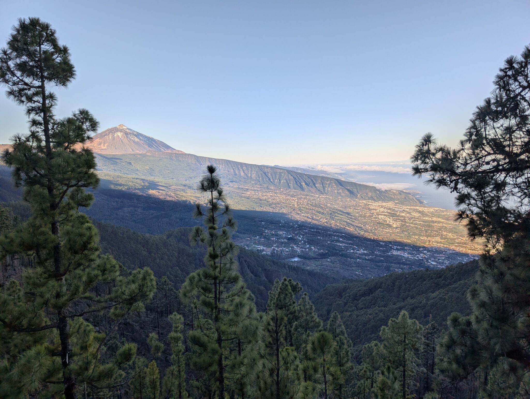 Bei La Caldera haben wir plötzlich freie Sicht. Vor uns erhebt sich der Teide, dessen dunkle Flanken von Schneeresten durchzogen sind. Gleichzeitig sehen wir weit unten an der Nordküste die Stadt Puerto de la Cruz, deren helle Häuser sich entlang des Atlantiks ausbreiten. Ein paar Hochhäuser stechen aus der sonst eher flachen Skyline heraus.