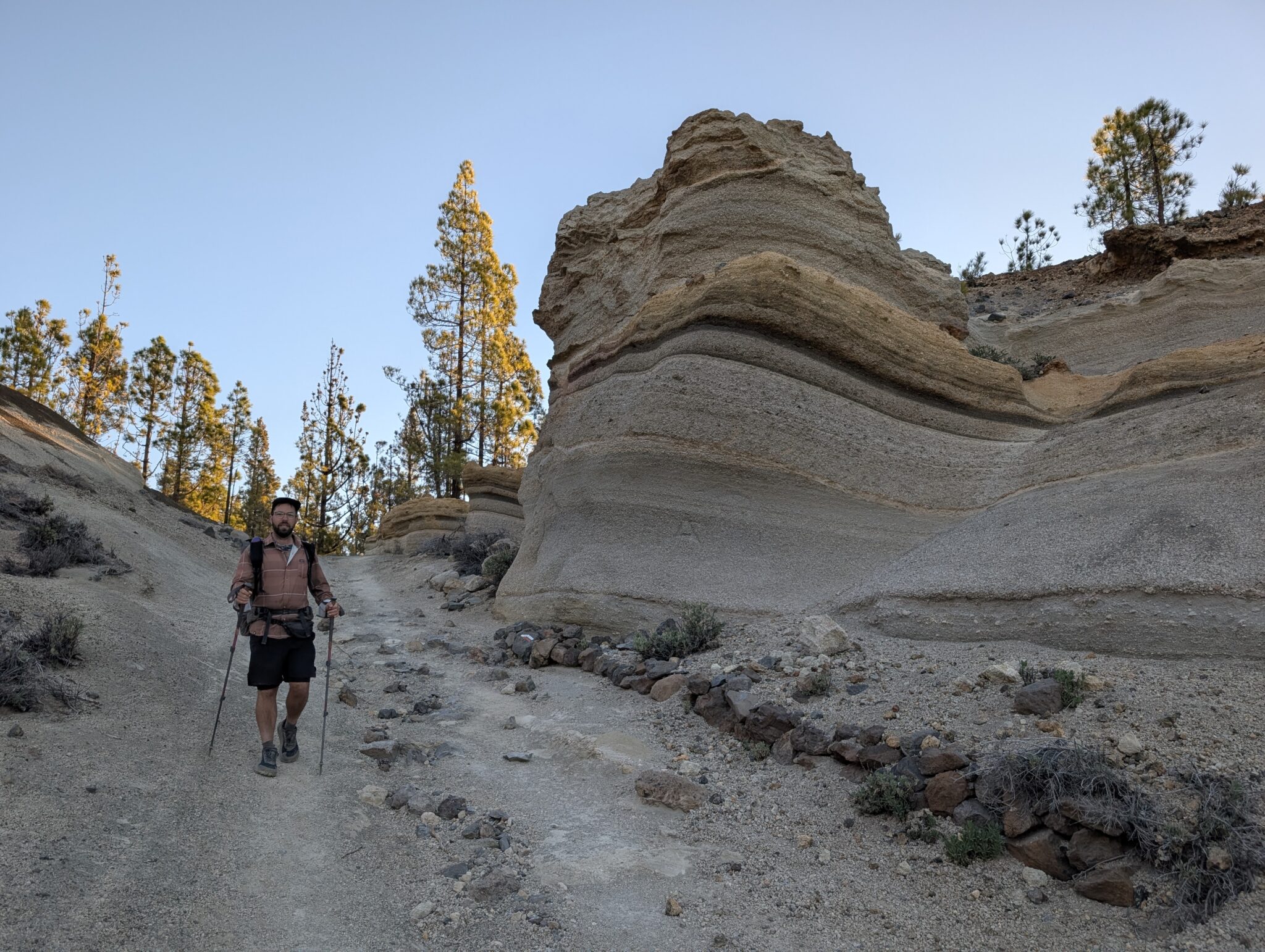 Es ist acht Uhr, und wir beginnen den letzten Tag des GR 131 auf Teneriffa mit dem Weg in die Stadt. Bis nach Vilaflor sind es etwa sechs Kilometer, größtenteils abwärts durch den Wald. Zuerst kommen wir an den hellen Felsen Paisaje Lunar (Mondlandschaft) vorbei.
