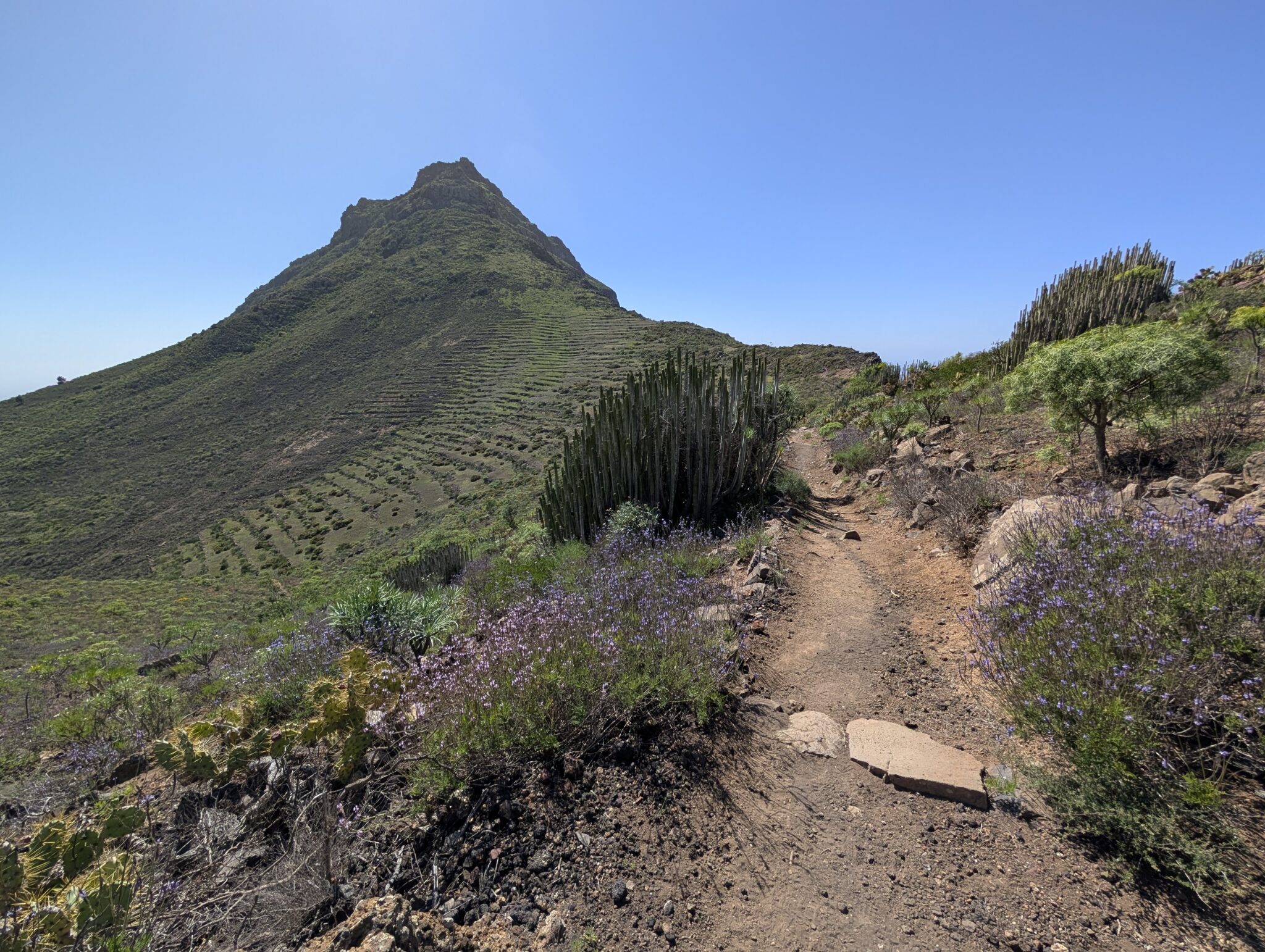 Zum Ende von Teneriffa gibt der GR 131 noch einmal alles. Der Trail zieht sich hoch über der Küste entlang, mit weitem Blick auf das Meer. In der Ferne liegt La Gomera im Dunst, während sich unter uns die Landschaft langsam zur Küste öffnet. Zwischen den Felsen wachsen Kakteen in allen möglichen Formen, dazwischen zahlreiche Wildblumen. Es fühlt sich fast so an, als würden wir durch einen botanischen Garten laufen. Rechts von uns ragen rote Felsen in wilden Formationen auf, links erheben sich grüne Berggipfel und unten im Tal sehen wir das Meer. Irgendwo dort unten liegt Arona, unser Ziel für heute und Ende des GR 131 auf Teneriffa.