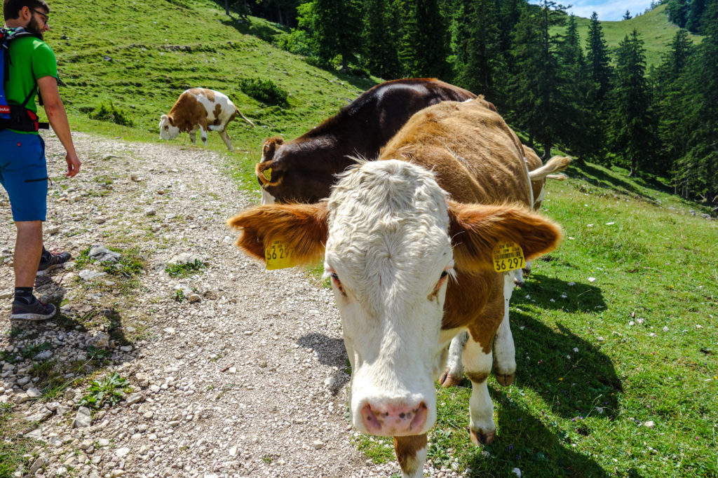 Es folgen zwei weitere Almen und hinter der letzten, der Bründling-Alm, erhebt sich ein kleiner Aussichtshügel mit Kreuz darauf. Viel Volk ist hier unterwegs und wir lassen ihn erstmal rechts liegen. Der Weg schlängelt sich nun in Serpentinen steiler hinauf. Die Sonne ist fein, aber ist nur umso heißer, schwüler, drückender. Mir läuft der Schweiß nur so runter.