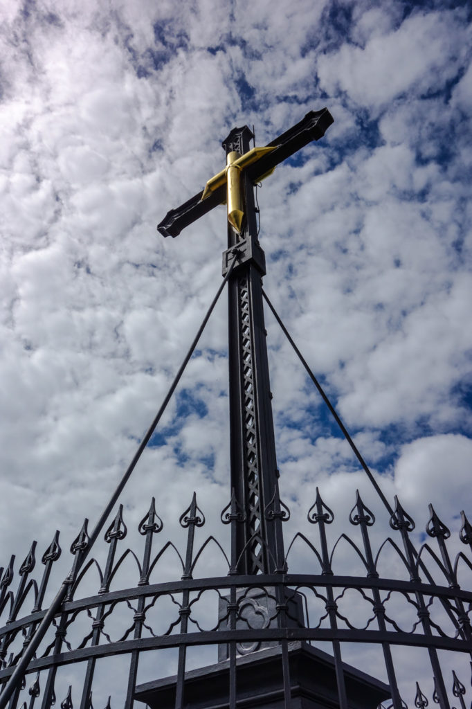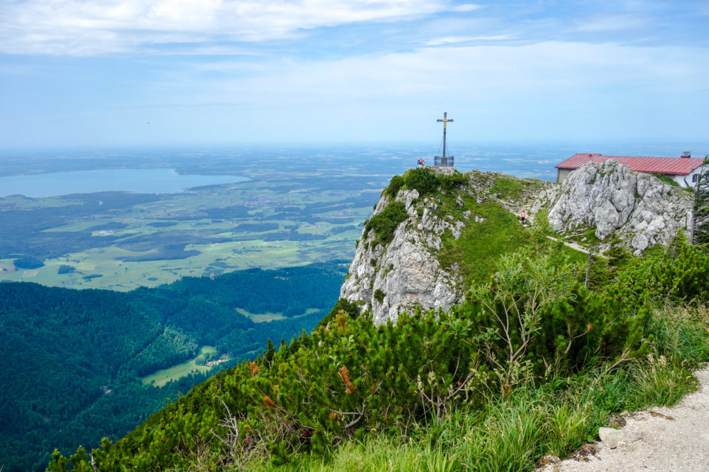 Wahnsinn! Was für ein Ausblick in alle Richtungen. Bis zu den Gletschern der Hohen Tauern können wir blicken, Großvenediger und Großglockner ausmachen. Auch der Dachsteingletscher schimmert hinter dem Watzmann hervor. Niemals hätte ich mit so einer Sicht beim Aufbruch im Regen heute Vormittag gerechnet. Natürlich sind auch Chiemsee und die Chiemgauer Berge wie Hochgern im Blick. Ich kann mich gar nicht sattsehen. Wir gehen noch hinüber zum Gipfelkreuz, das auf einem kleinen Felsvorsprung thront. Dahinter findet sich das Hochfellnhaus. Hier gönnen wir uns nochmal ein Getränk und einen Käsekuchen, den wir mehr oder weniger mit den vielen Dohlen teilen, die hier auf ein Häppchen warten. Nicht ohne vorher das Gipfelkreuz einen Besuch abzustatten.