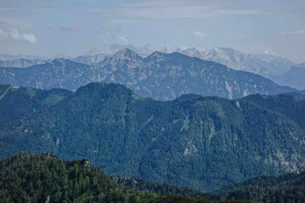 Oben in der Scharte queren wir auf die andere Seite und vor uns bauen sich auf einmal Kaisergebirge und Watzmann-Massiv auf. Ein paar letzte Kehren führen nun hinauf zum Gipfel des Hochfelln und der Bergstation der Seilbahn. Wir steigen bis zum höchsten Punkt wo eine kleine Kapelle steht.
