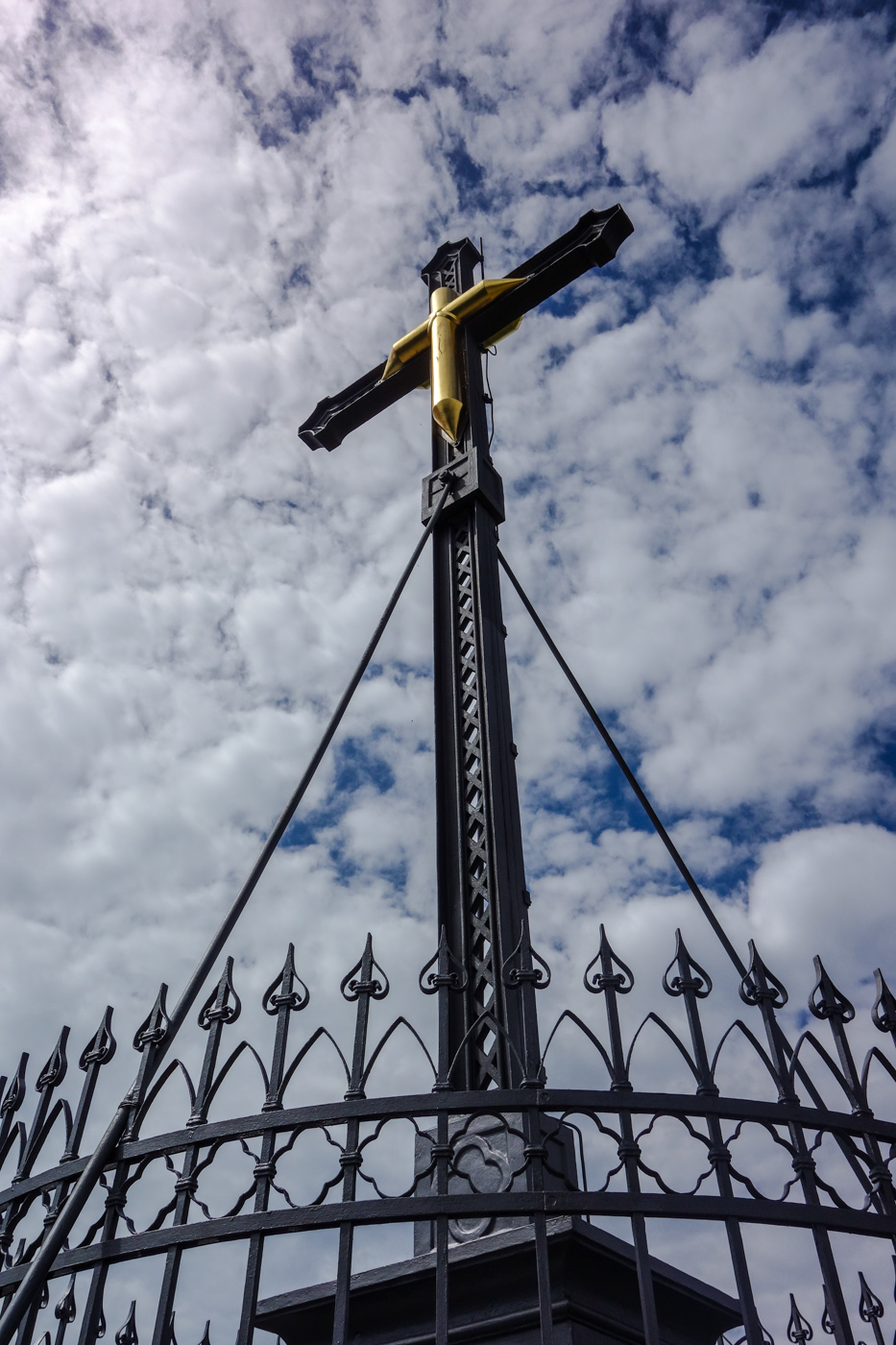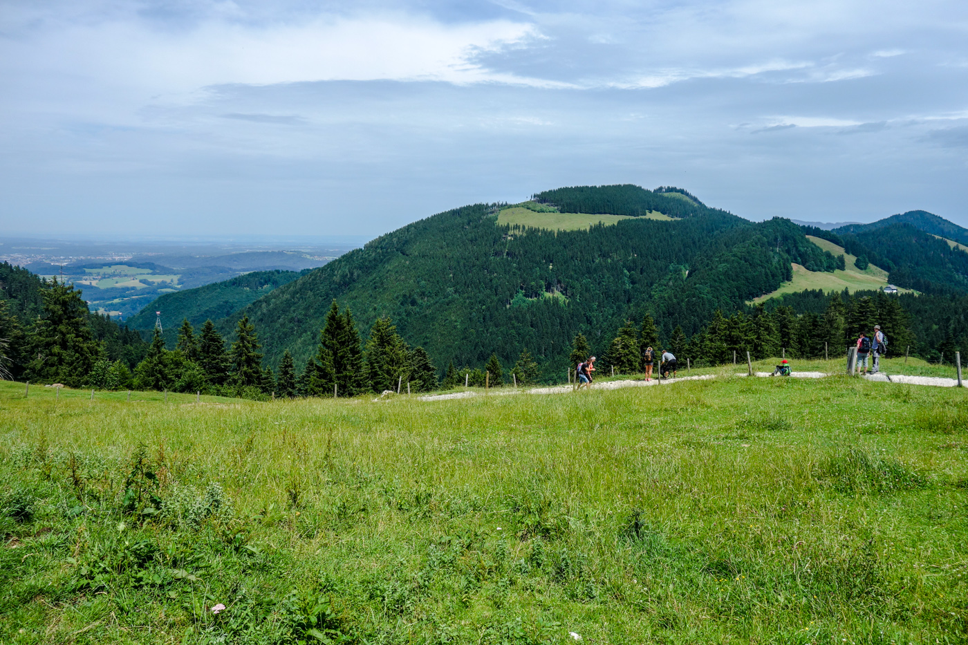 Es folgen zwei weitere Almen und hinter der letzten, der Bründling-Alm, erhebt sich ein kleiner Aussichtshügel mit Kreuz darauf. Viel Volk ist hier unterwegs und wir lassen ihn erstmal rechts liegen. Der Weg schlängelt sich nun in Serpentinen steiler hinauf. Die Sonne ist fein, aber ist nur umso heißer, schwüler, drückender. Mir läuft der Schweiß nur so runter.
