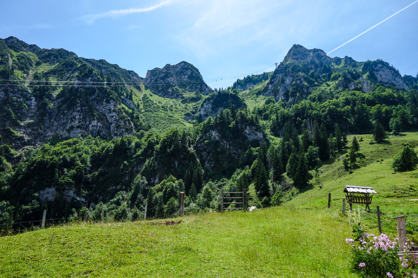 Es regnet als wir unsere Wanderung auf den Hochfelln in Kalkofen starten und meine Motivation hinauf zu gehen hält sich in Grenzen. Glücklicherweise verläuft die erste Hälfte des Anstiegs auf einfachem Forstweg im Wald, sodass uns Regenschutz geboten wird.