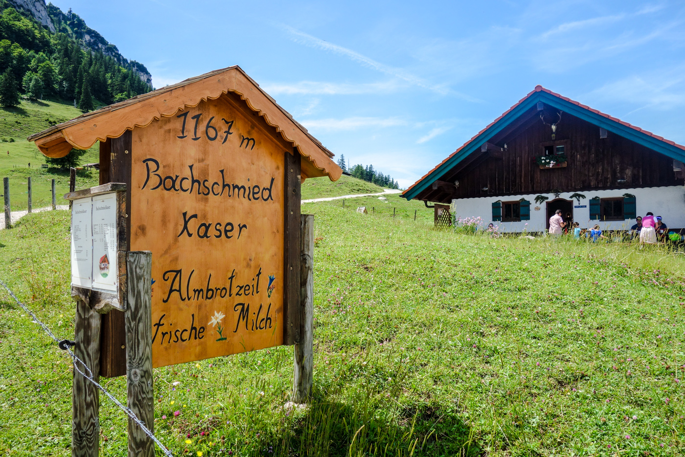 Am Fluss entlang geht es in gemütlicher Steigung durch den tropfenden Wald und immer wieder kreuzen Eichelhäher den Weg. Es ist drückend schwül trotz Regenguss und wir schwitzen alle was das Zeug hält. Dann geht es ein kurzes Stück steiler über Wurzeln und Felsen zur Mittelstation, die wir aber links liegen lassen und rechts zu den Almen abzweigen. Aus dem Wald heraus treten wir nun auf eine breite Forststraße und gelangen nach kurzer Zeit zu den Almen. Beim urigen Bachschmiedkaser kehren wir auf ein kühles Getränk ein und lassen den Schweiß etwas trocknen. Während wir da so sitzen, verändert sich das Wetter schlagartig und die Sonne erstrahlt vor blauem Himmel.
