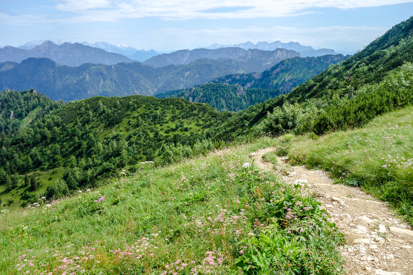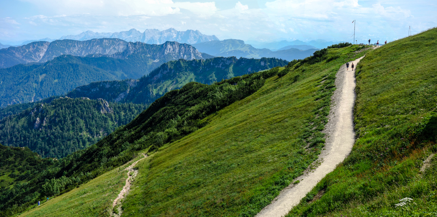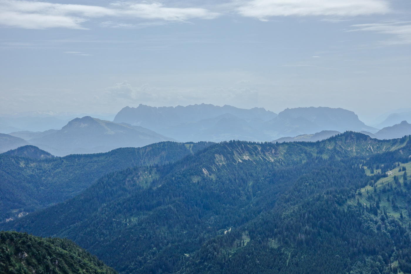Oben in der Scharte queren wir auf die andere Seite und vor uns bauen sich auf einmal Kaisergebirge und Watzmann-Massiv auf. Ein paar letzte Kehren führen nun hinauf zum Gipfel des Hochfelln und der Bergstation der Seilbahn. Wir steigen bis zum höchsten Punkt wo eine kleine Kapelle steht.